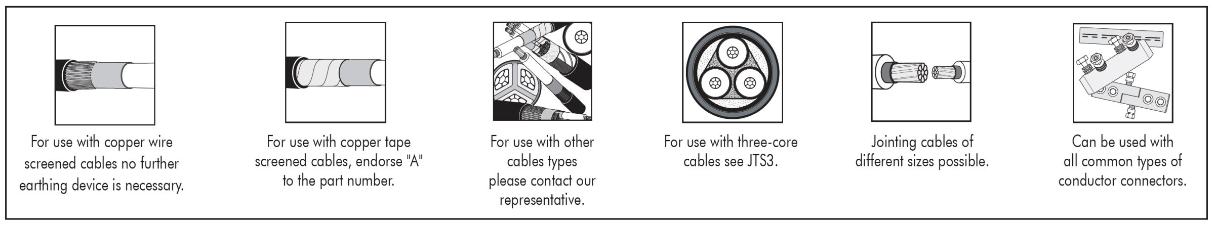 • Heat-shrinkable straight joints JTS1 meet international performance standards including CENELEC HD 629.1 and IEC 60502-4.