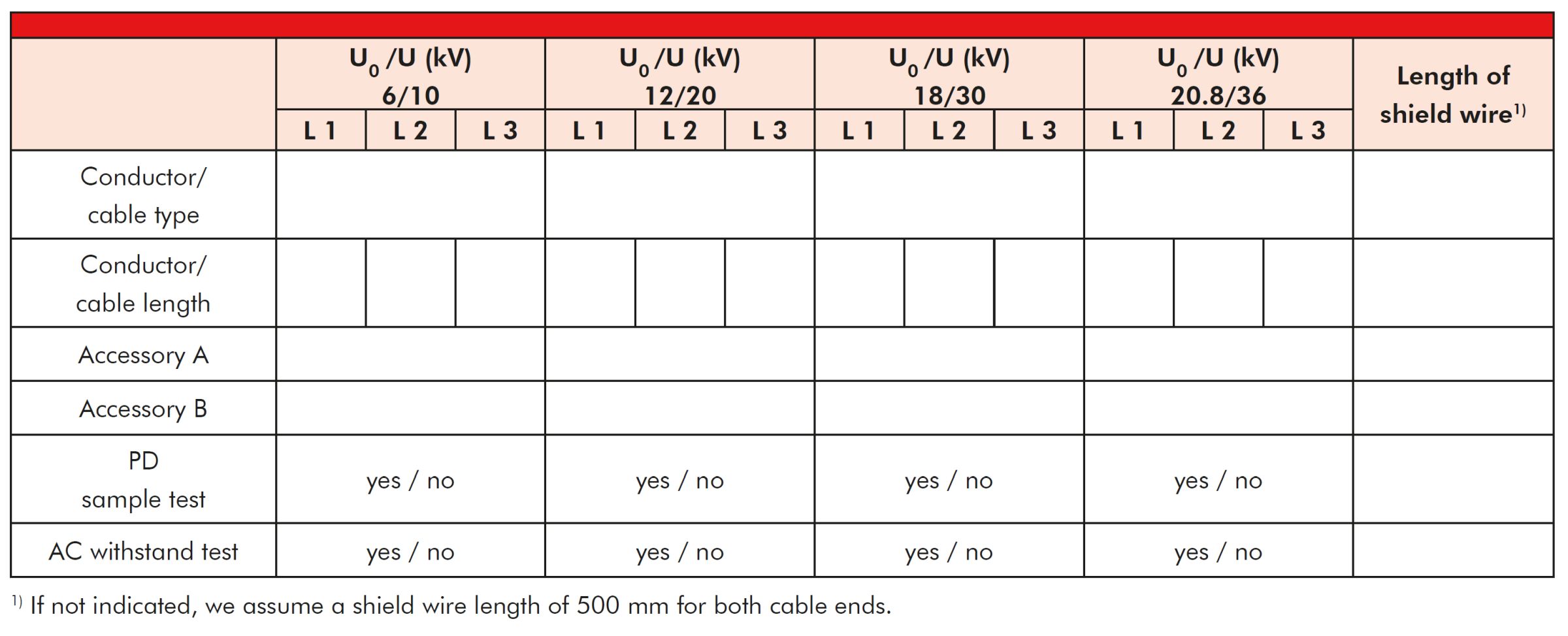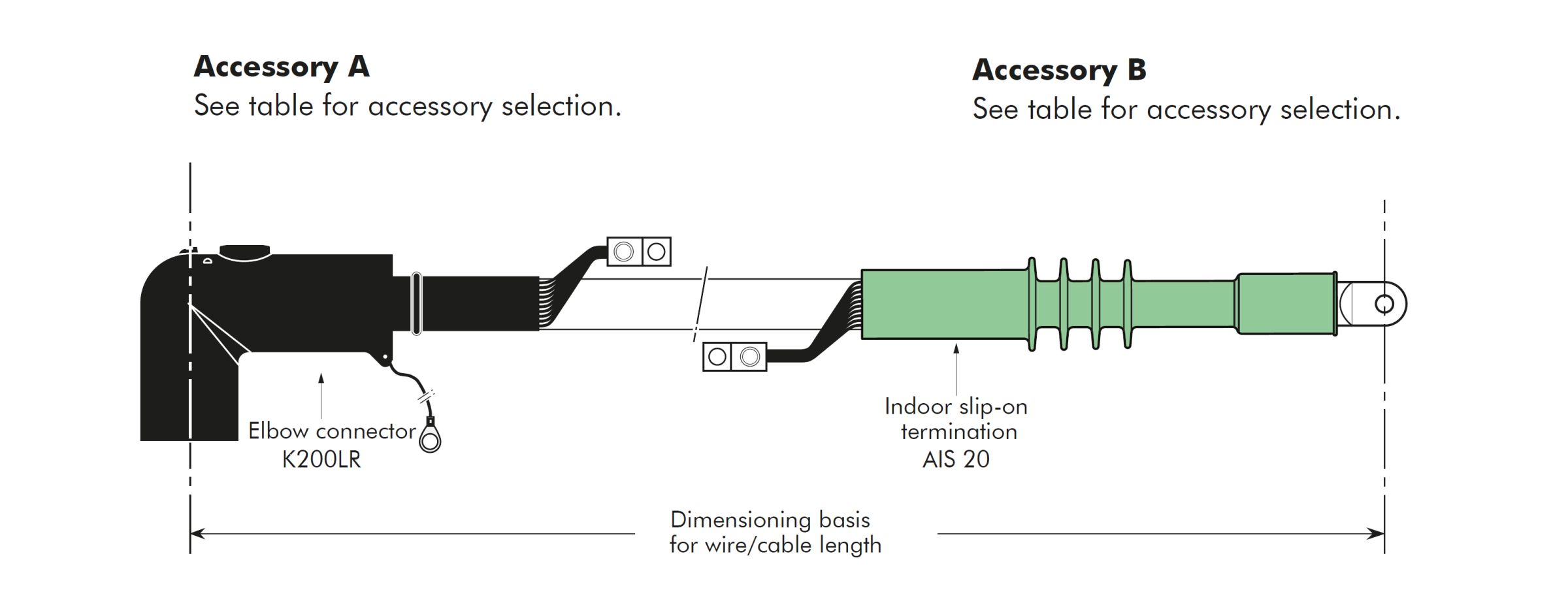 When dimensioning the pre-assembled cable length, we take the center points of both cable accessories as the basis. When indicating the length of the shield wire, please also specify whether the shield wire should be lead out on one or both sides.