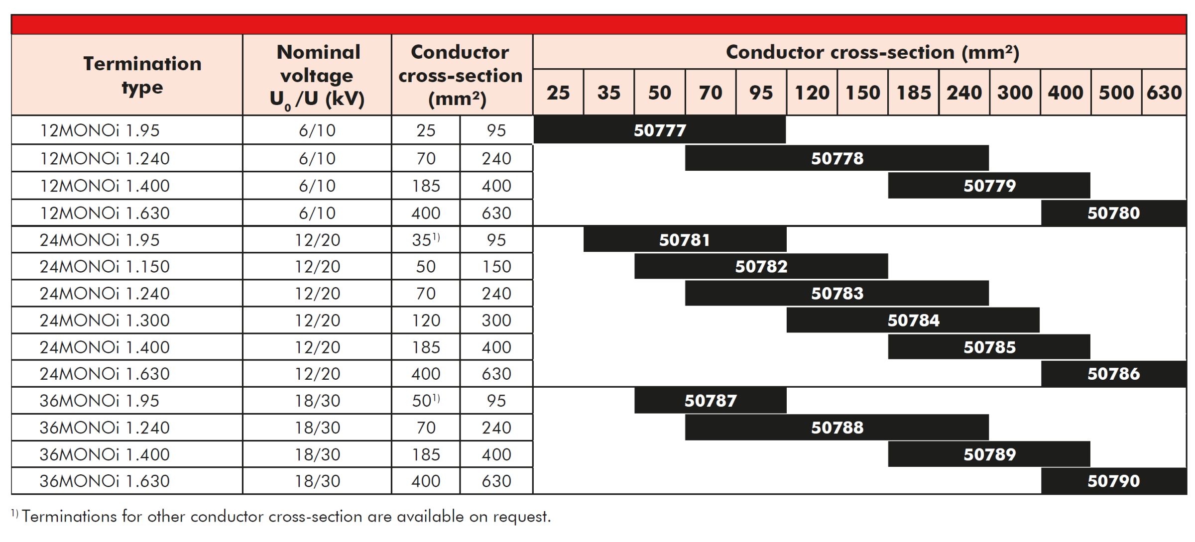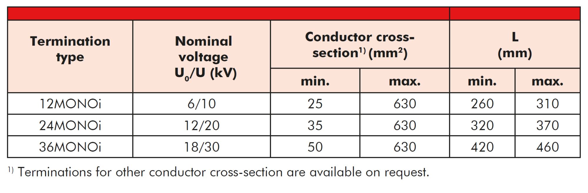 1) Terminations for other conductor cross-section are available on request.