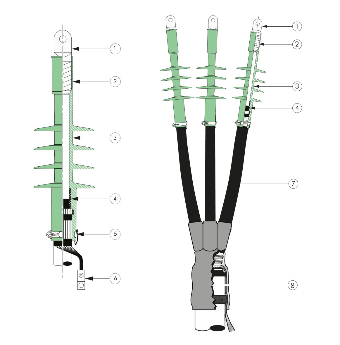 This high-quality silicone termination covers a large range of cross-sections with just two sizes per voltage level. Another benefit is the quick and easy assembly. The conductor is connected with mechanical cable lugs. Available with additional splitting accessories for three-core cables.