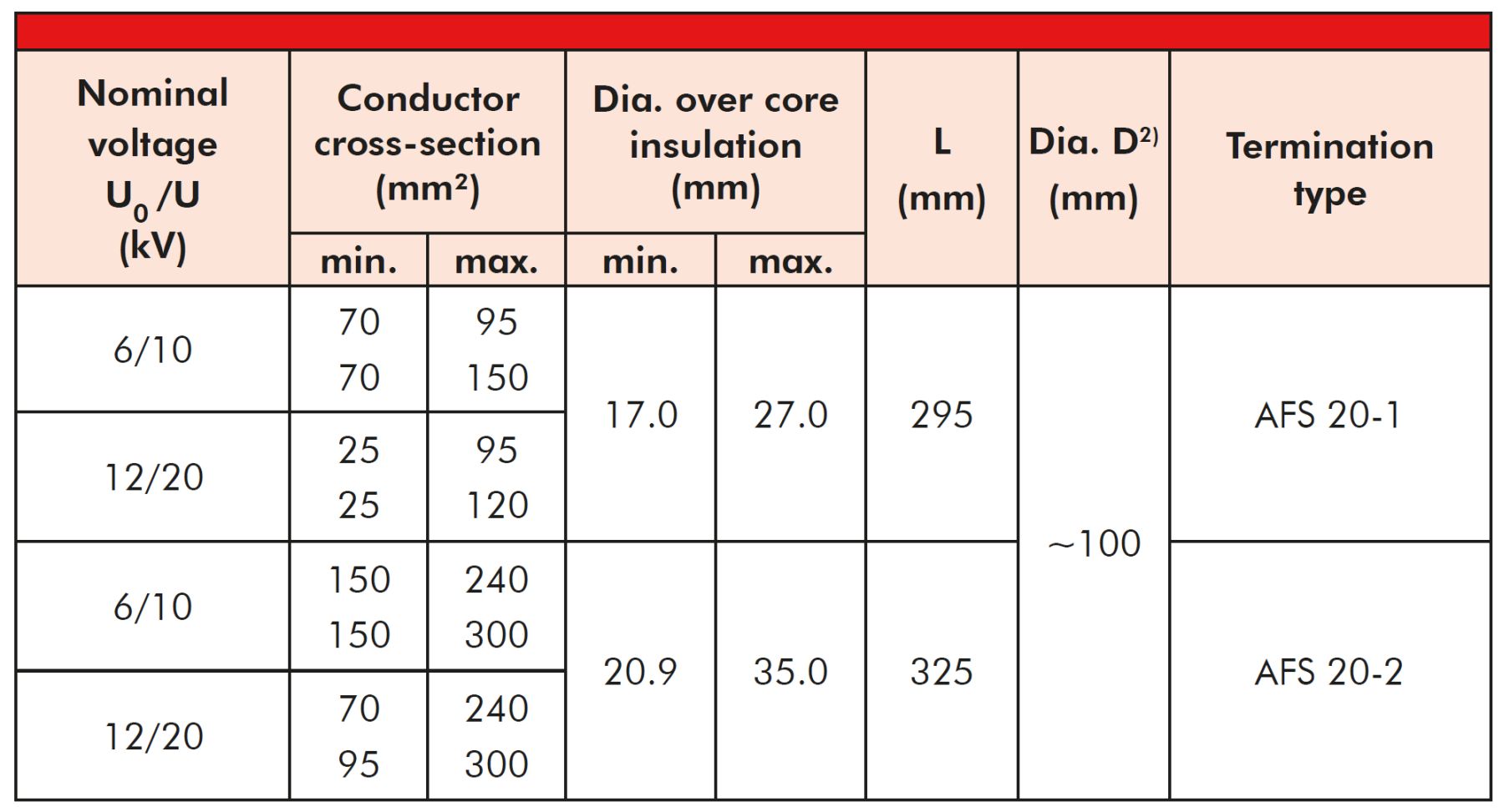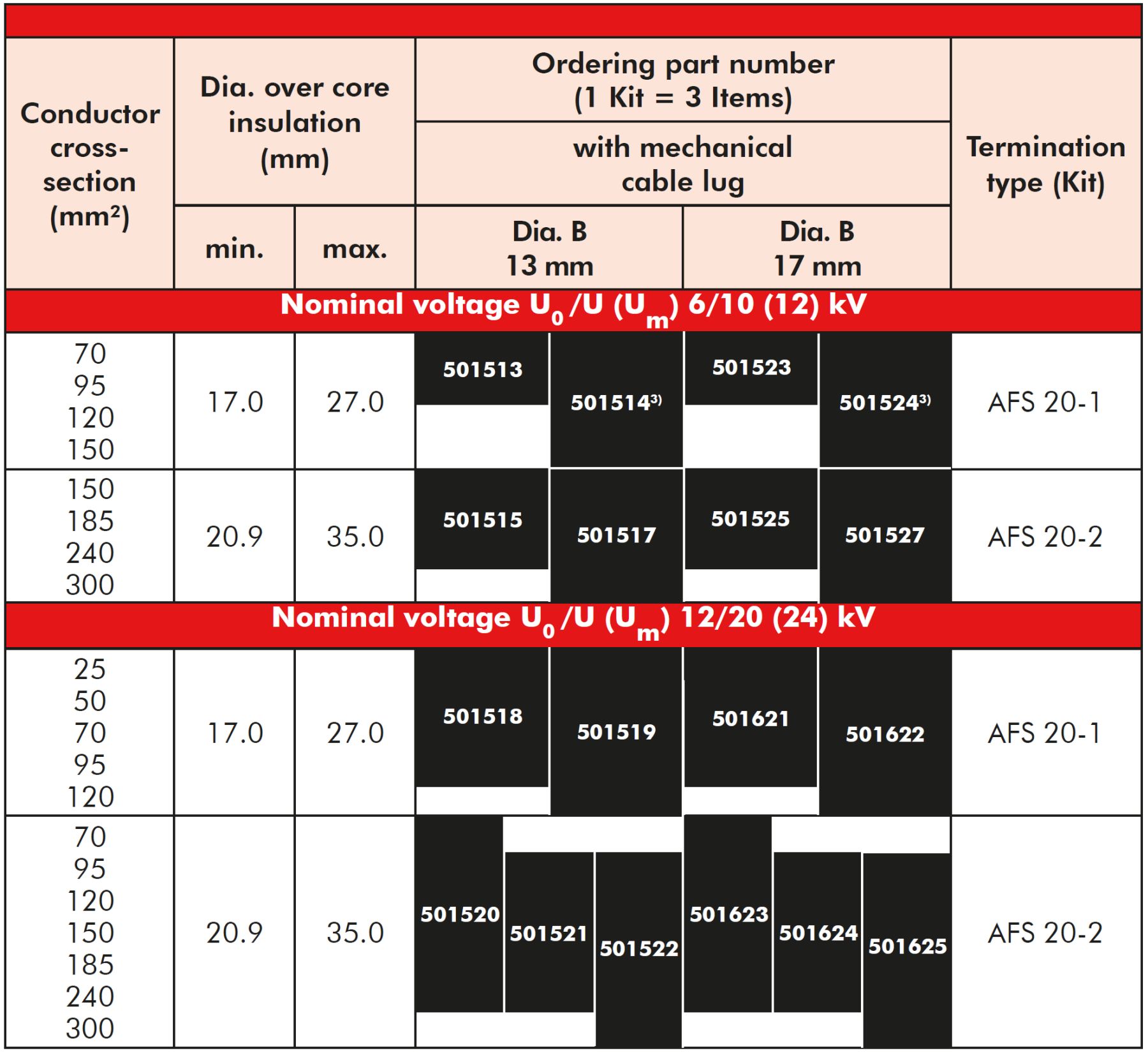 1 AFS 20 kit for 12/20 kV, for 70-240 mm² with mechanical cable lug (palm hole diameter 13 mm).