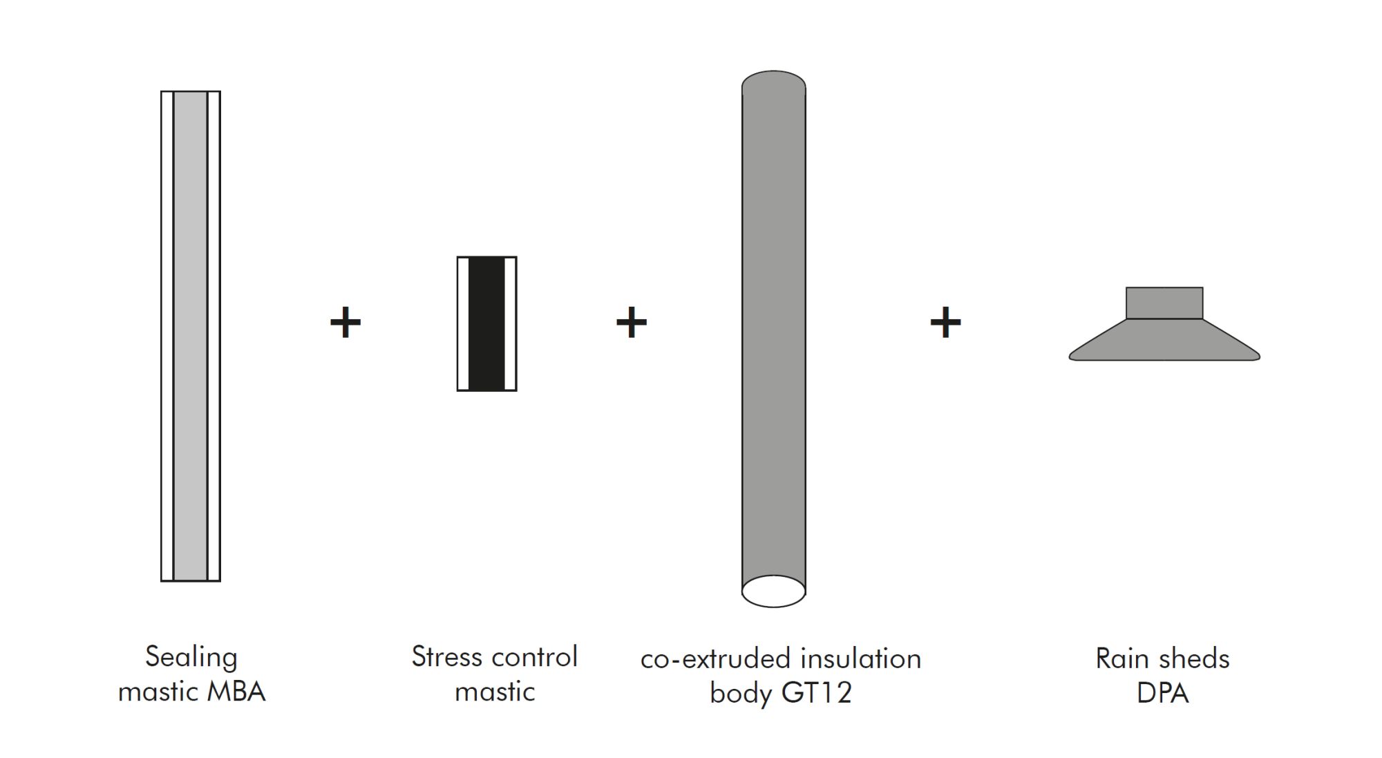 The one-piece, co-extruded (dual wall) insulation body GT12 consists of an inner stress control tube and an outer anti-tracking layer. It can be shrank on the prepared cable in at least one shrinking procedure and is characterized by a very low construction length.